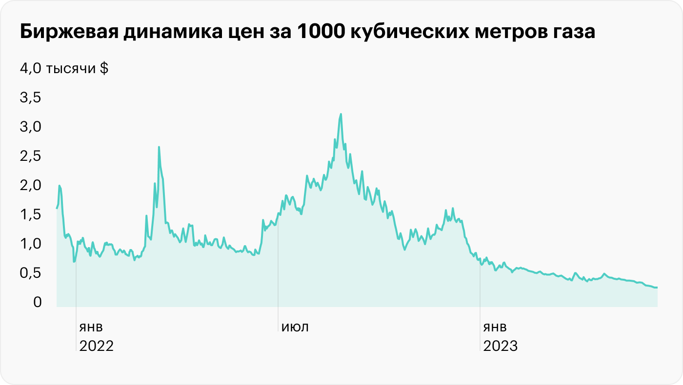 Другой негативный драйвер в 2023 году — биржевая коррекция на энергетических рынках, в рамках которой цены на газ в ЕС опустились ниже 350 $ за 1000 кубических метров, в то время как в 2022 году они практически всегда держались выше 1000 $. Основная причина такой динамики — теплая погода в Европе.