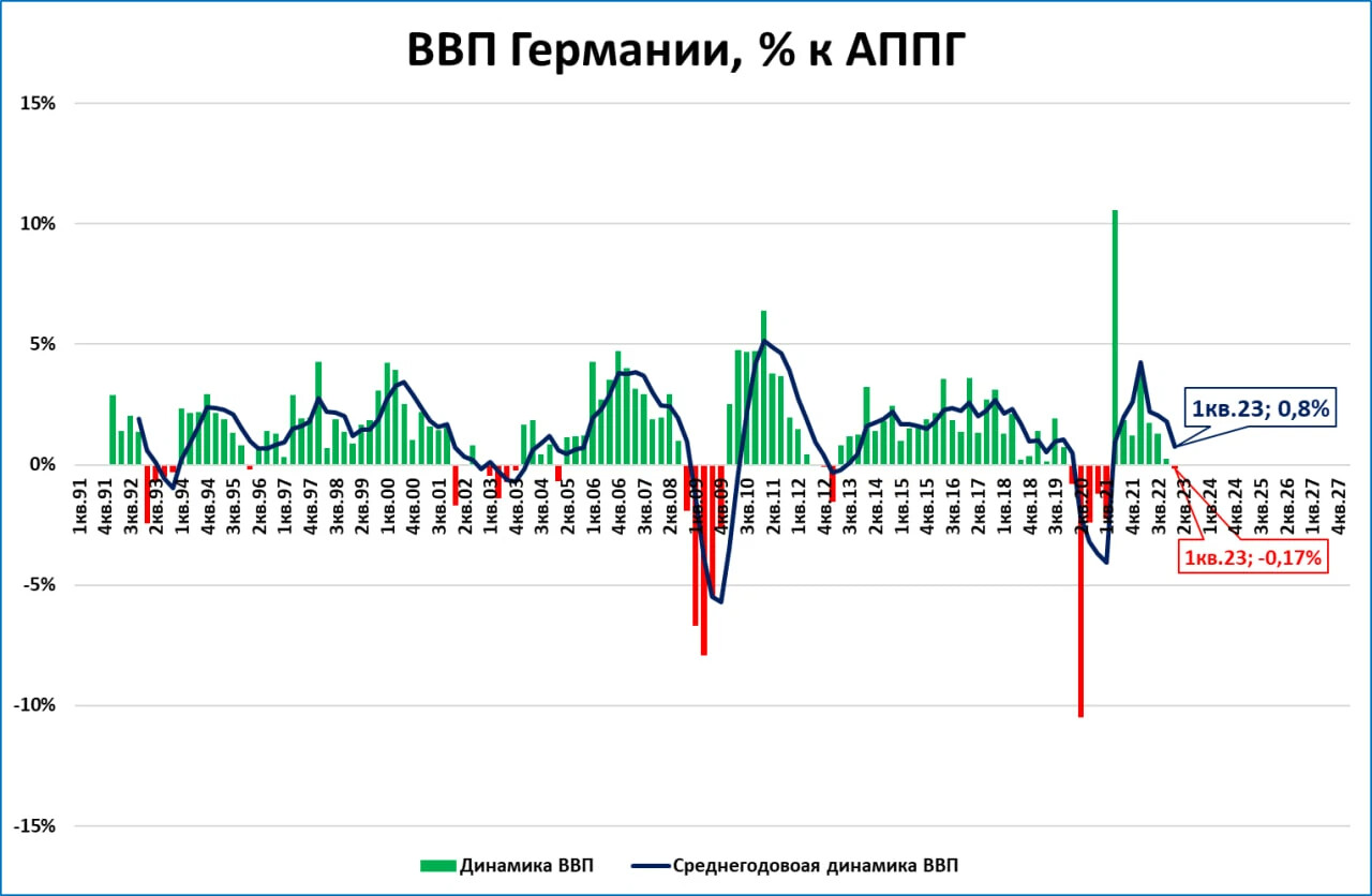 ВВП в Германии в 1 квартале снизился на 0,2% по отношению к 1 кварталу 2022 года.