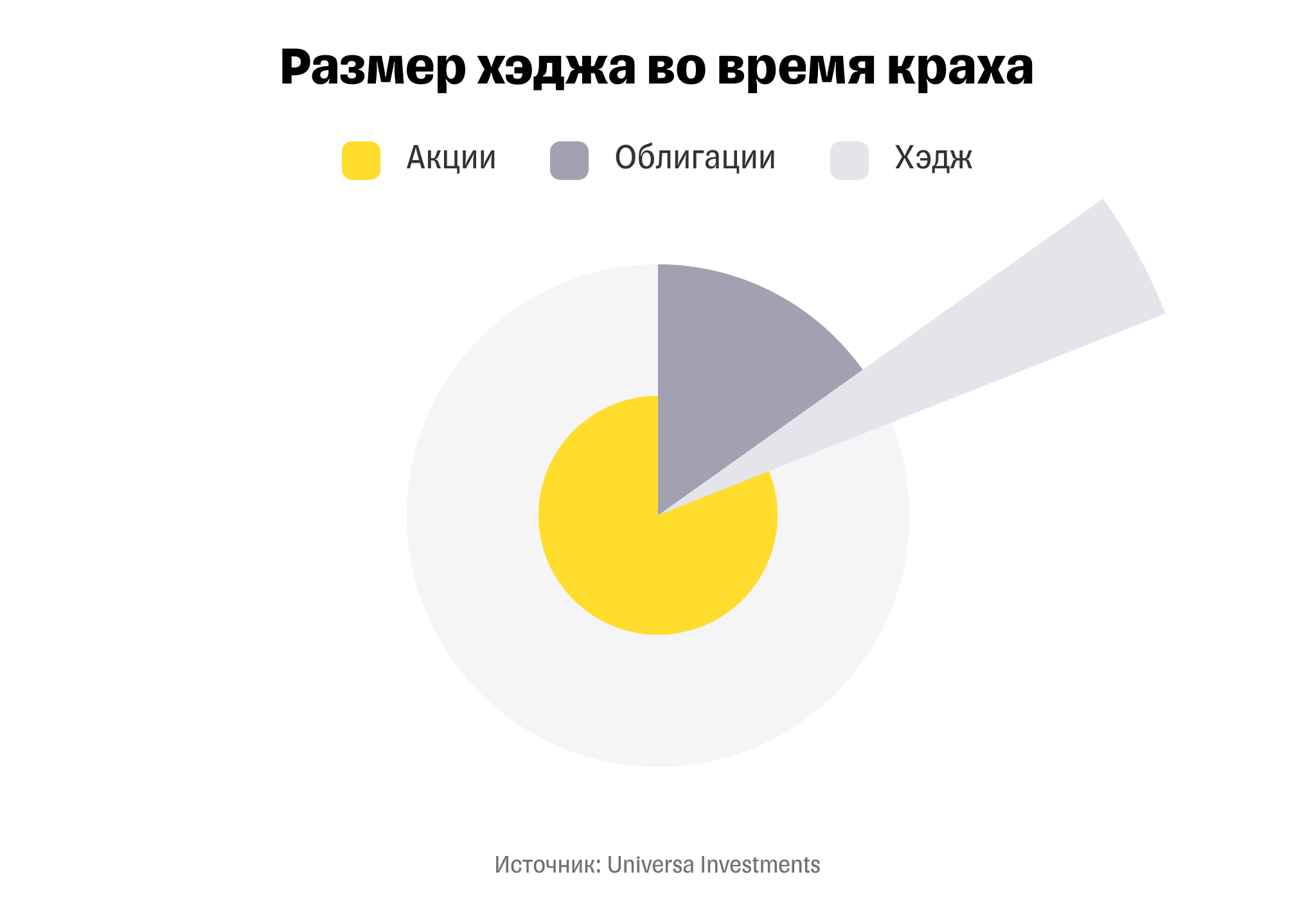 Как происходит «защита»? Несколько процентов от защищаемого капитала Universa инвестирует в хедж — инструменты, которые имеют огромную отрицательную корреляцию с портфелем в момент просадки. В основе хеджа — торговля опционами на разные классы активов (индексы, акции и сырье), которые находятся сильно «вне денег» и потому стоят крайне дешево, как писали Forbes, Bloomberg и упоминал сам Шпицнагель. «Большую часть времени ты выглядишь как идиот, потому что держишь инструменты, которые никому не нужны», — рассказывал он Forbes.