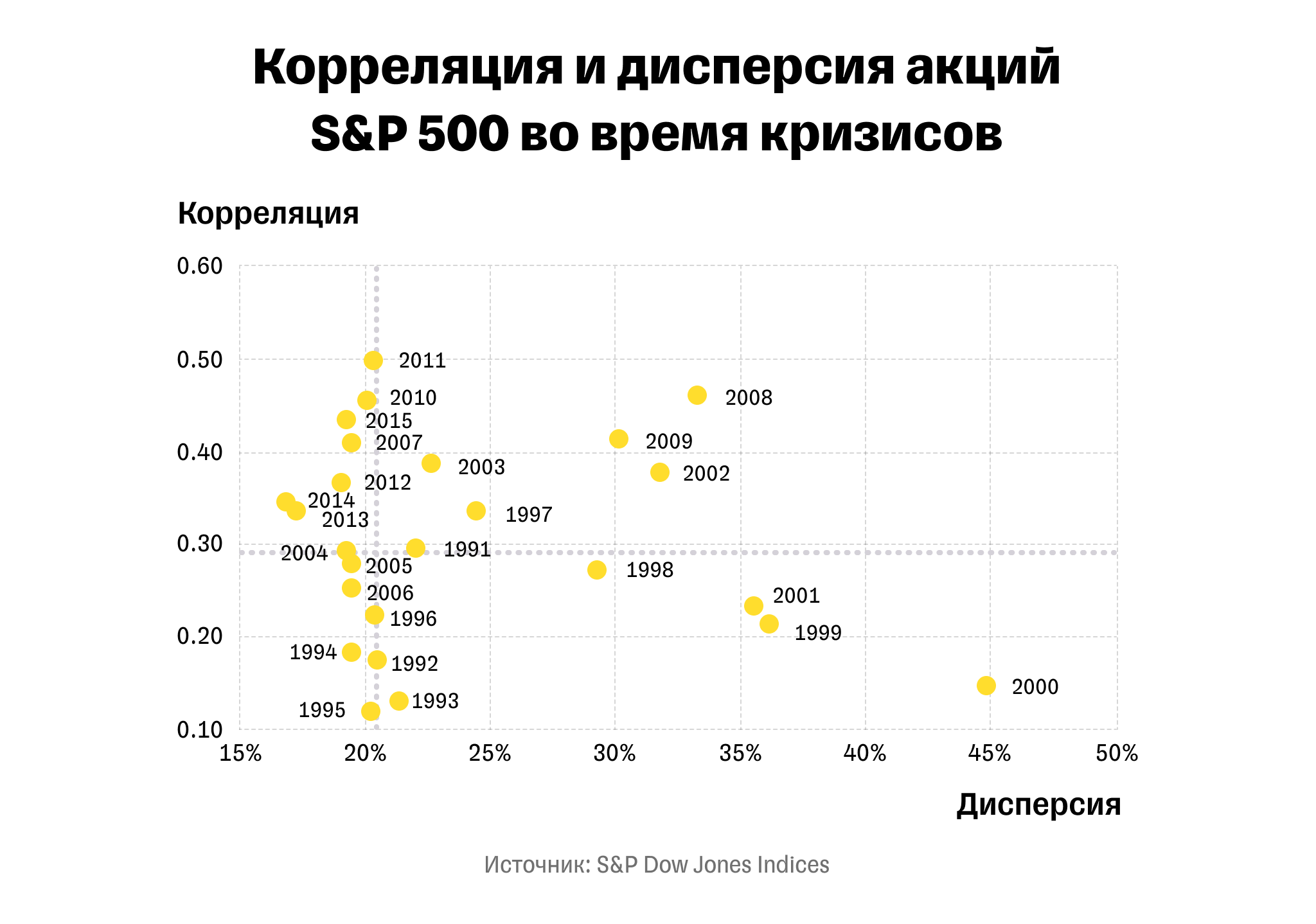 Это хорошо видно по карте кризисов S&P Global: с 1990-х до начала 2010-х корреляция между активами сильно выросла. И если во время краха доткомов в начале 2000-х инвесторы еще могли спрятаться в какие-то активы, то в 2008 году рынок падал синхронно, а корреляция достигла пика относительно всех более ранних кризисов.