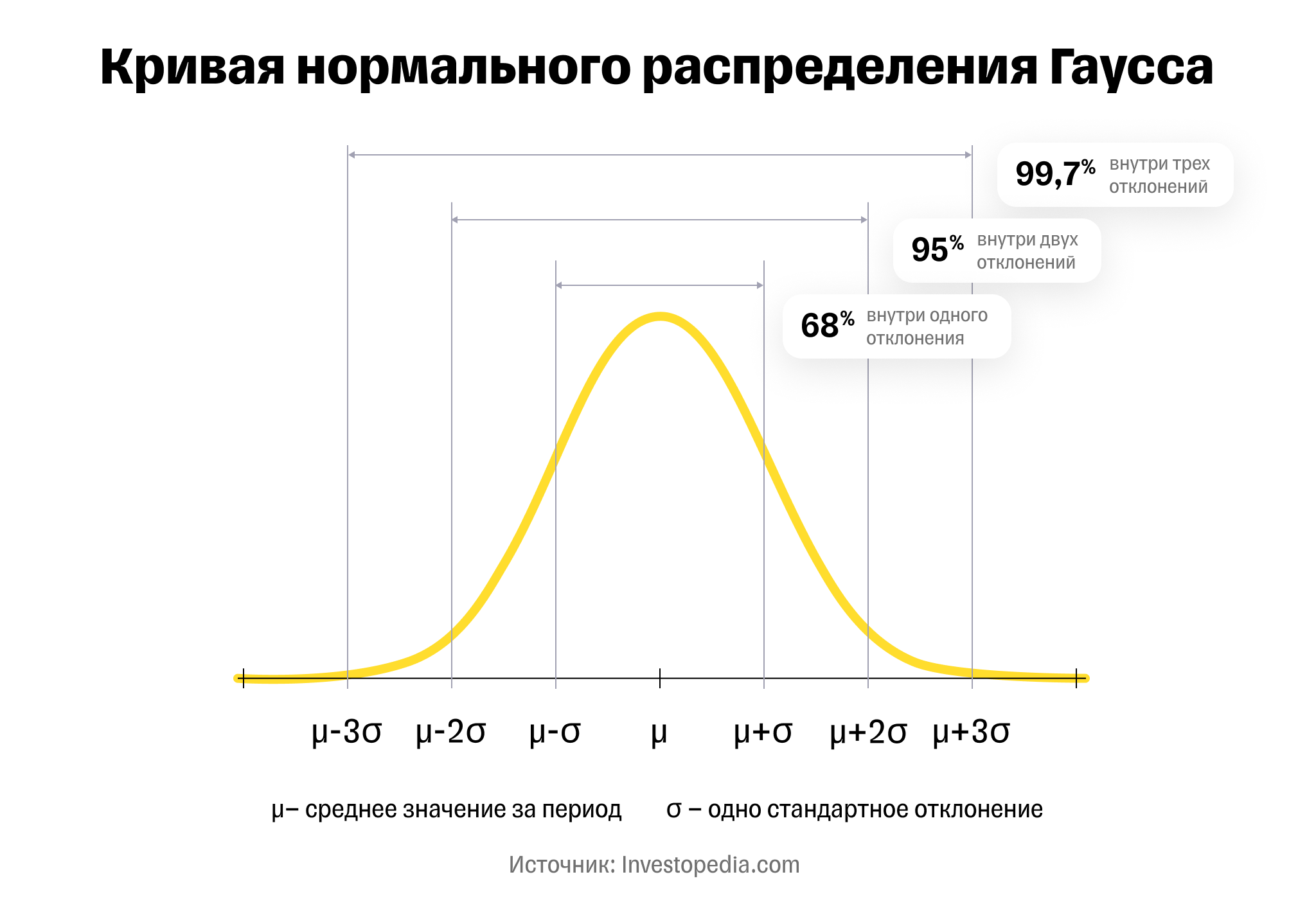 3. Существует правило трех сигм: в 99,73% случаев цена актива меняется максимум на три стандартных отклонения. При этом чем больше цена отклоняется от среднего, тем стремительнее падает вероятность хоть раз увидеть ее на рынке: большинство, или 68%, колебаний цены лежит в рамках одного стандартного отклонения, всего 27% — в пределах второго стандартного отклонения, и только 2,7% — в пределах третьего. Это хорошо видно на так называемой гауссовой кривой нормального распределения (см. график). За третьим отклонением начинаются «хвосты» кривой, где располагаются экстремально отклонившиеся цены: при оценке рисков ими можно пренебречь, ведь вероятность увидеть такие цены практически равна нулю (отсюда и название «хвостовые риски»).