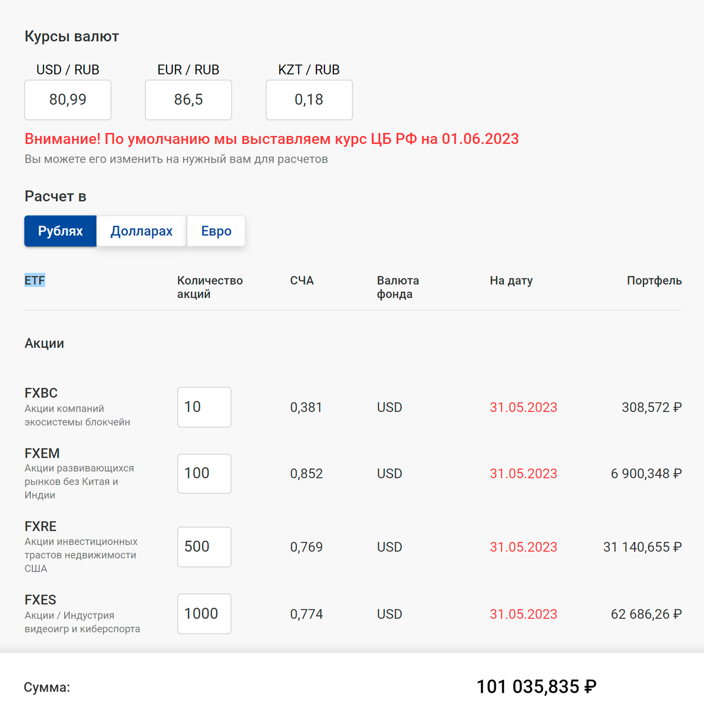Еще на сайте компании есть сервис, показывающий актуальную расчетную цену паев. Можно указать, какие ETF FinEx у вас есть и сколько паев, и увидеть стоимость отдельных позиций и всего портфеля. Можно также получить расчет на электронную почту.