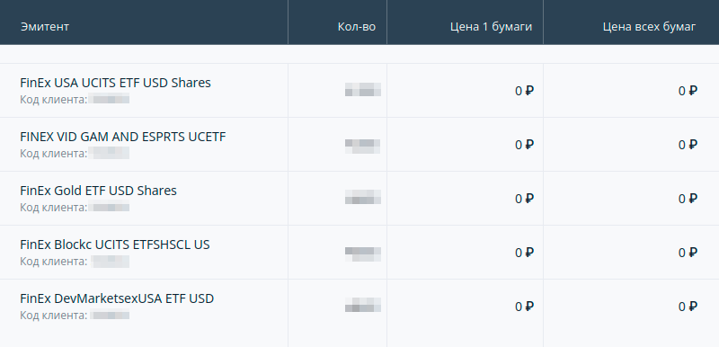 Информация о части фондов FinEx, которую дает «Кит-финанс». Цена бумаг и стоимость позиций нулевая. Эти бумаги были перемещены к этому брокеру с ИИС, открытого в Сбербанке. Источник: личный кабинет на сайте брокера «Кит-финанс»