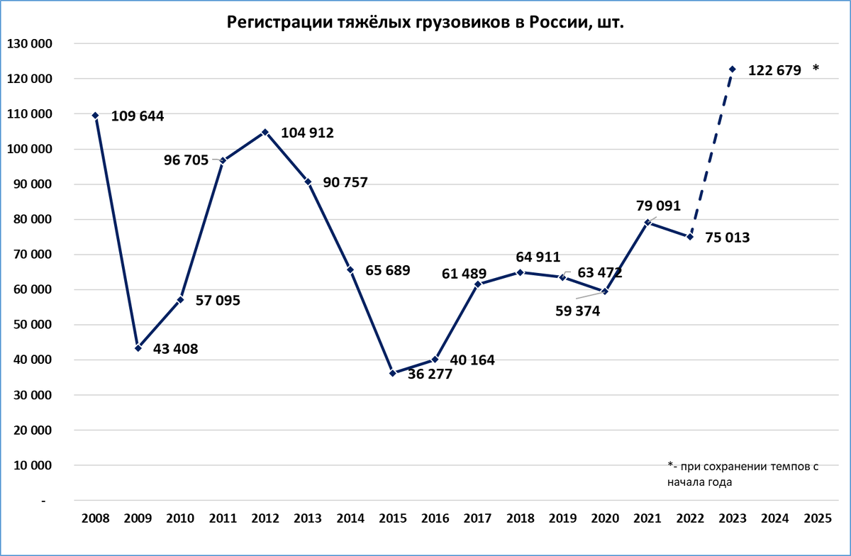 Это станет повторением рекорда 2007 года, когда объём рынка тяжёлых грузовиков составил 122,9 тыс. штук. Но возможен и сценарий, при котором в этом году российский рынок установит новый рекорд.