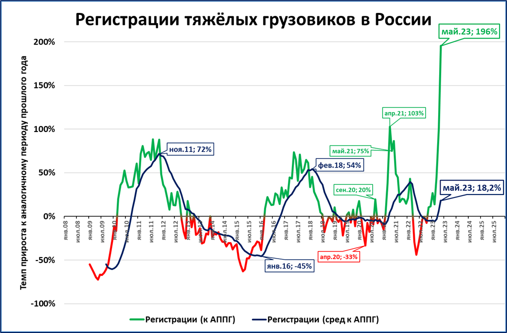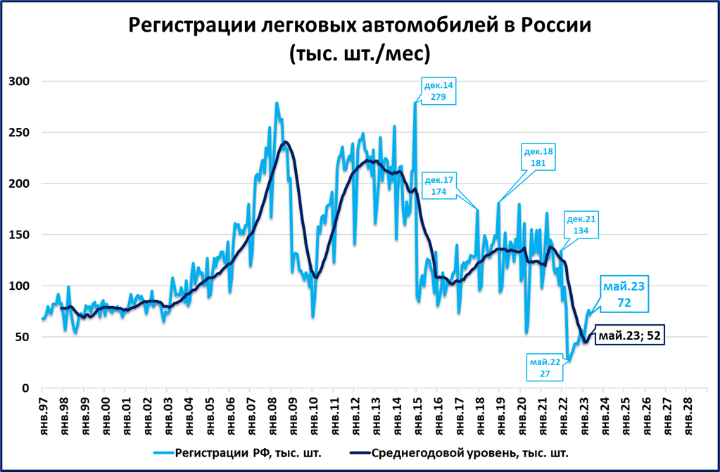 ● Рынок грузовиков в мае вырос в 3 раза к маю прошлого года. 2023 год может стать рекордным для российского рынка, превысив значение 2007 года (123 тыс.).
