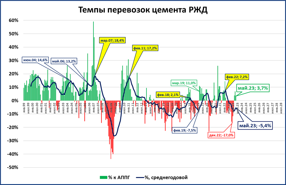 В мае перевозки цемента по железным дорогам по нашим расчётам* выросли на 3,7%.