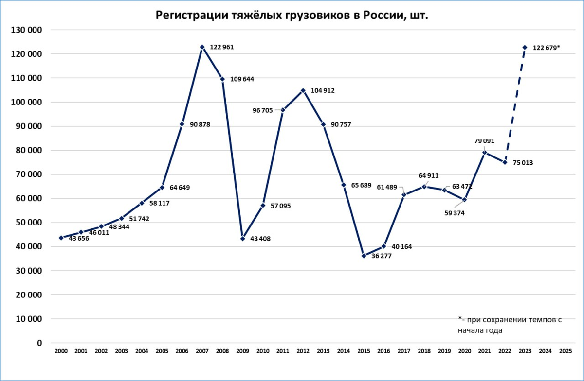 Это станет повторением рекорда 2007 года, когда объём рынка тяжёлых грузовиков составил 122,9 тыс. штук.