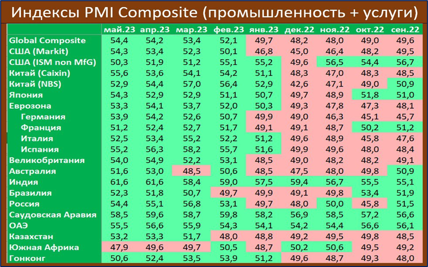 Несмотря на снижение деловой активности в промышленности многих стран (см. выше), деловая активность в целом продолжает расти. Об этом говорит композитный индекс деловой активности, отражающий ситуацию в экономике в целом (промышленность + услуги).