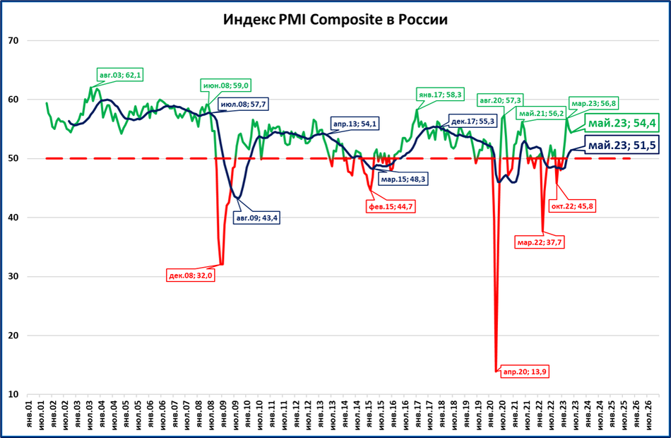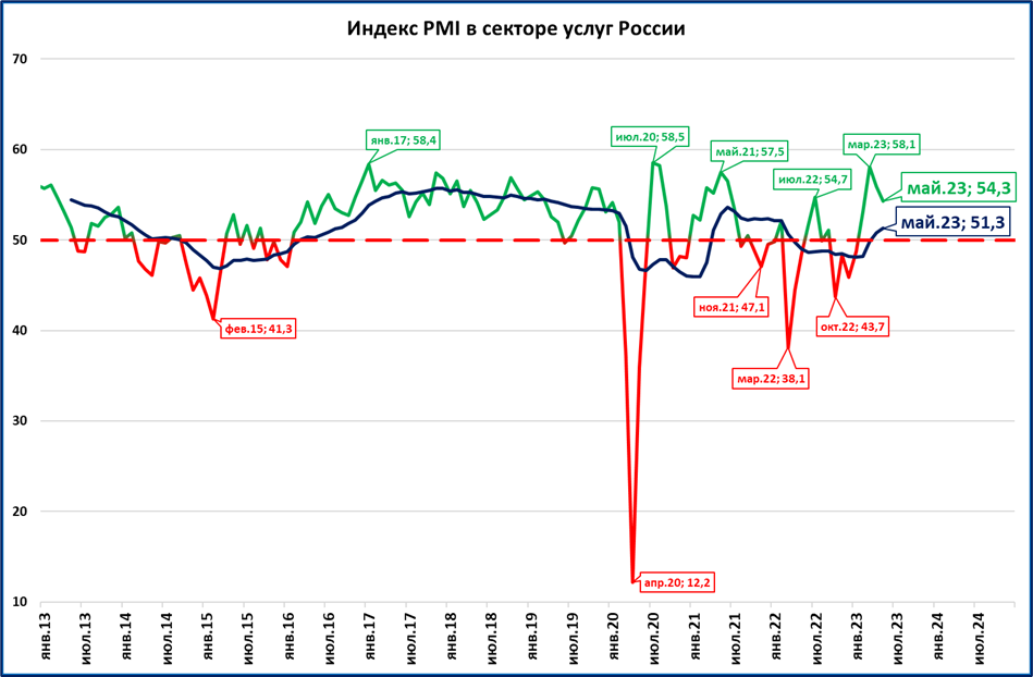 Индекс деловой активности в сфере услуг (54,3 пункта) тоже говорит о том, что деловая активность растёт.