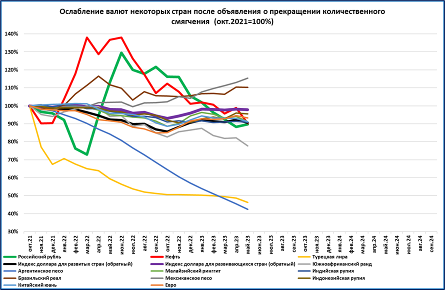 Когда ФРС весной 2013 года объявила о предстоящем в 2014 году сворачивании количественного смягчения, валюты развивающихся стран отреагировали на это снижением.