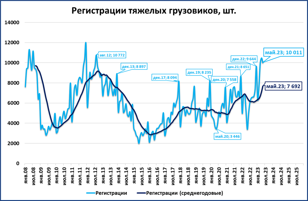 В мае по нашей предварительной оценке рынок тяжёлых грузовиков составил 10 тыс. единиц.