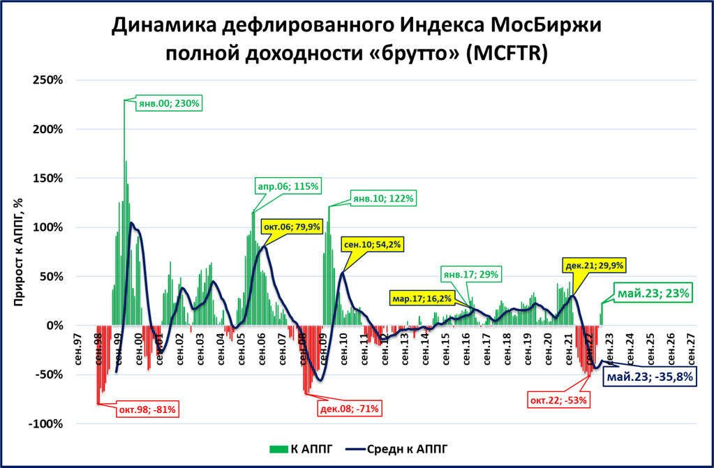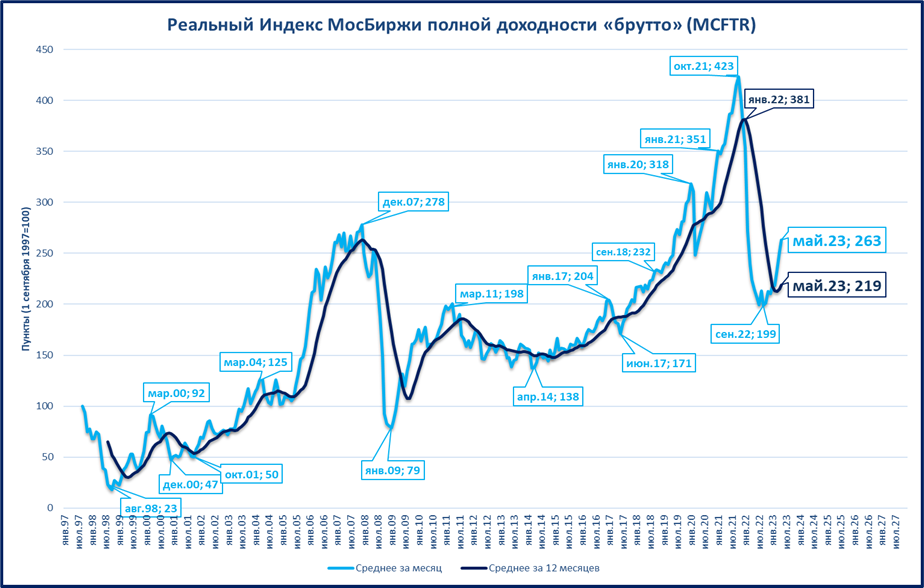 ● Реальный индекс полной доходности (учитывает дивиденды и инфляцию) показывает более высокий рост: +23%.
