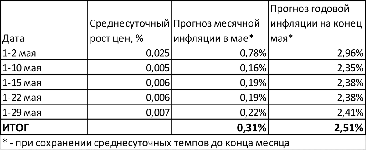 Пока не будем учитывать всплеск инфляции в первые дни июня. Учтём фактическую инфляцию в марте, апреле и мае (0,37; 0,38; 0,31%, соответственно). Средний рост цен в этот период составил 0,35% в месяц.