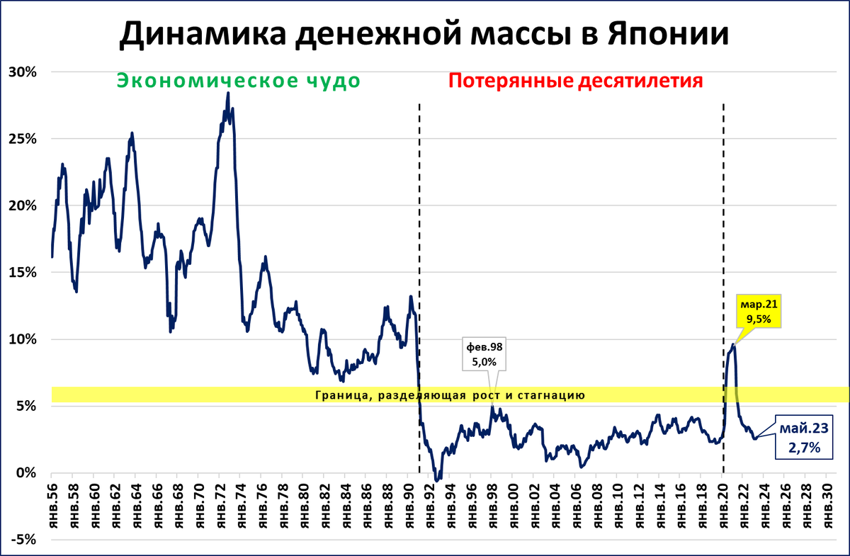 Так, динамика денежной массы хорошо объясняет, почему от экономического чуда, продолжавшегося до начала 1990-х годов, японская экономика перешла к низким темпам роста («потерянным десятилетиям»).