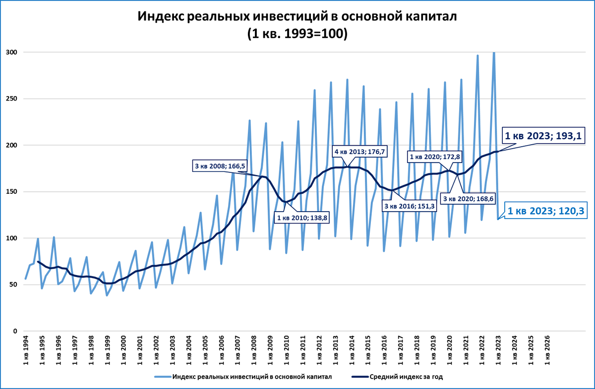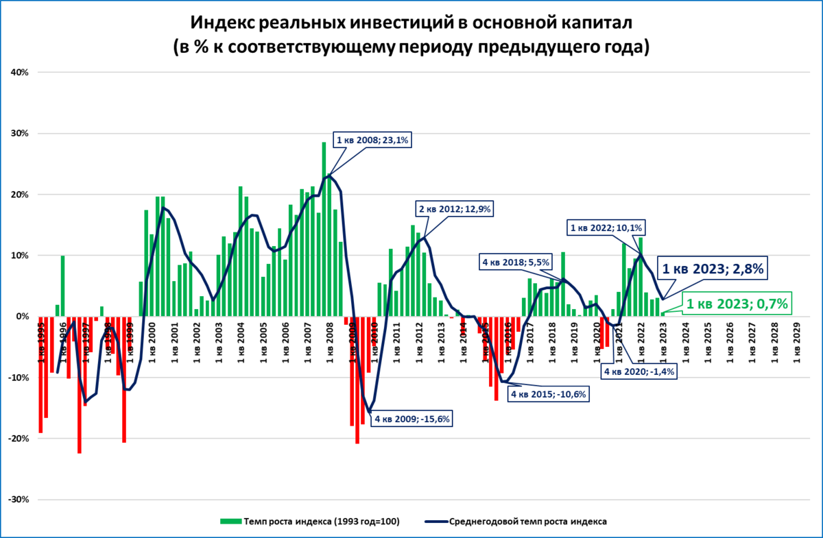 Если в 2023 году инвестиции вырастут, пусть даже такими низкими темпами, как в 1 квартале, то по итогам года они установят рекорд с 1990 (ещё советского) года.