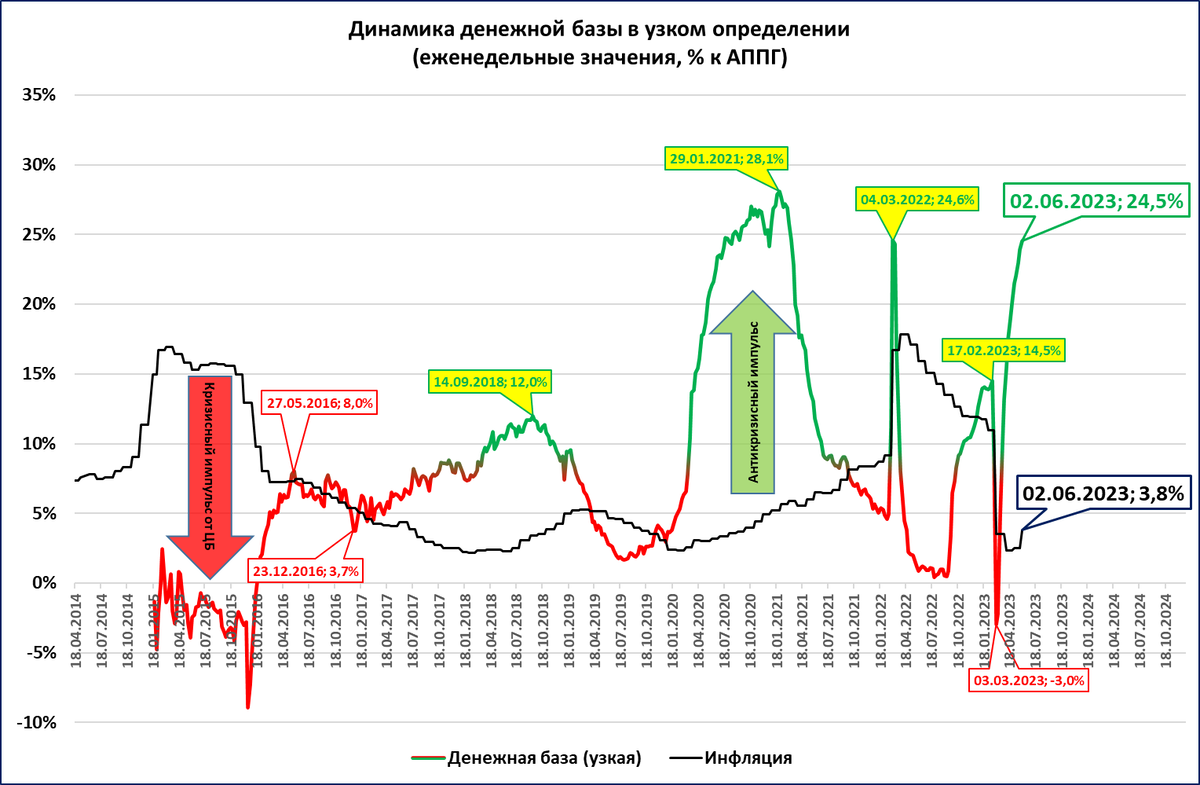 Только если ЦБ доведёт темпы роста денежной массы до 30-60% (как это было в 1999-2008 годах), станет ясно, какой должна быть ставка, чтобы инфляция при этом оставалась под контролем.