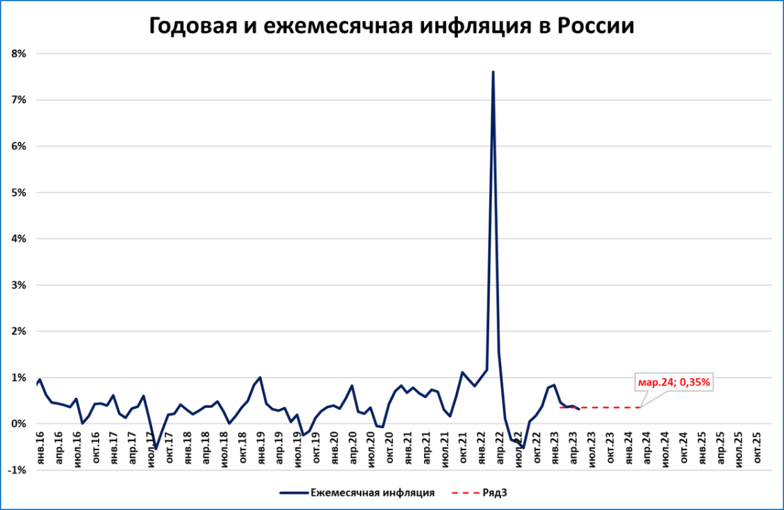 Если предположить, что такой ежемесячный рост (0,35% в месяц) сохранится в ближайшие 12 месяцев, то картина месячной инфляции будет такой: