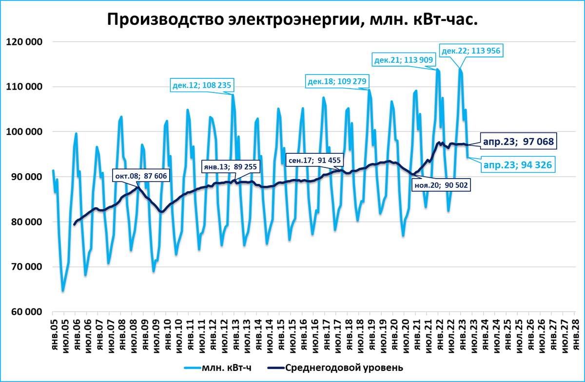 Среднегодовой уровень производства (тёмно-синяя линия на графике) сохраняется вблизи рекордных значений на одном и том же уровне (97+ млрд) с декабря 2021 года.