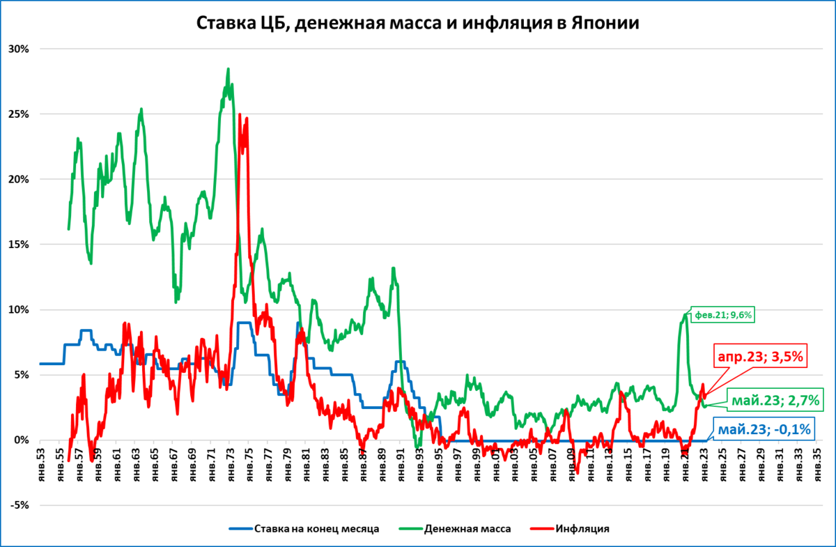 Япония – тот редкий пример, где инфляция исторически невелика. Поэтому очень хорошее представление о влиянии денежной политики на экономику может дать даже номинальная денежная масса.