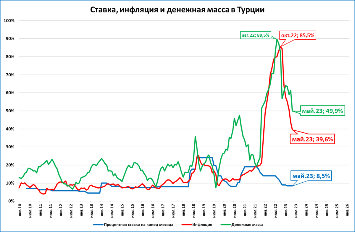 По итогам мая денежная масса в Турции выросла на 50%.