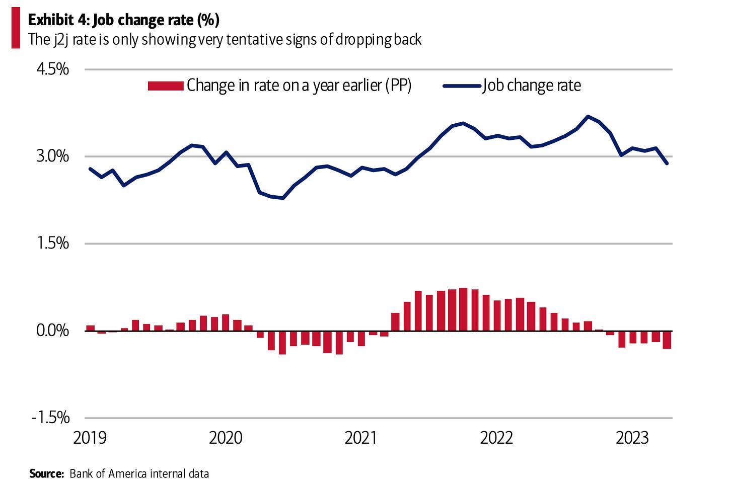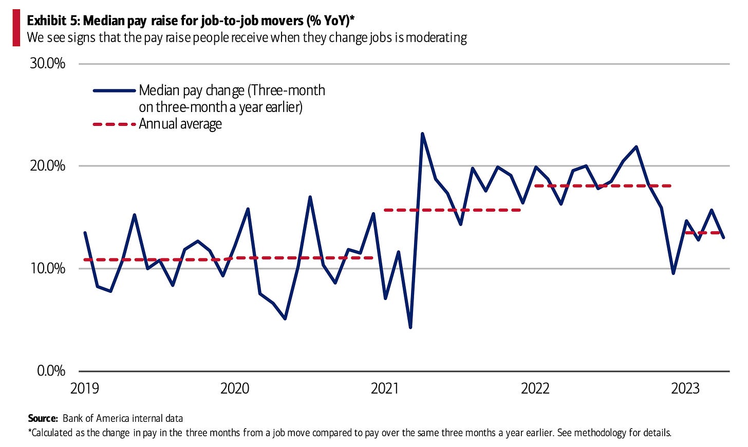 BofA: “С признаками того, что j2j замедляется, мы также обнаруживаем, что заработная плата, сокращается… До пандемии, похоже, те, кто менял работу, получали прибавку примерно на 10%. Затем этот показатель, по-видимому, вырос до 20%. Но по состоянию на апрель 2023 года повышение заработной платы снизилось до 13%“.