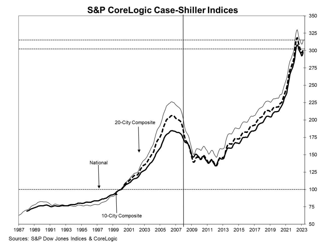 Цены на жилье растут. Согласно индексу S&P CoreLogic Case-Shiller, цены на жилье в марте выросли на 0,7% в месячном исчислении. Крейг Лаззара из SPDJI: “Два месяца роста цен не означают окончательного восстановления, но мартовские результаты свидетельствуют о том, что снижение цен на жилье, начавшееся в июне 2022 года, возможно, подошло к концу. Тем не менее, проблемы, связанные с текущими ставками по ипотечным кредитам, и сохраняющаяся возможность экономического спада, вероятно, останутся сдерживающим фактором для цен на жилье, по крайней мере, в течение следующих нескольких месяцев”.