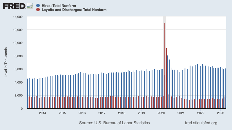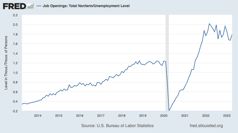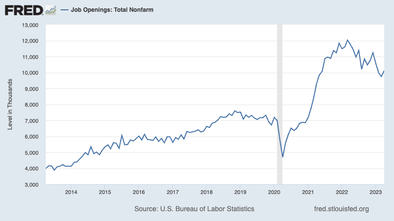 Пока мы обсуждаем вопрос о масштабе, 10,1 миллиона вакансий в апреле, хотя и снизились по сравнению с максимумом 2022 года, остаются значительно выше докризисного уровня. Этот избыточный уровень вакансий является одним из наиболее очевидных и интуитивно понятных отражений высокого спроса на рабочую силу.