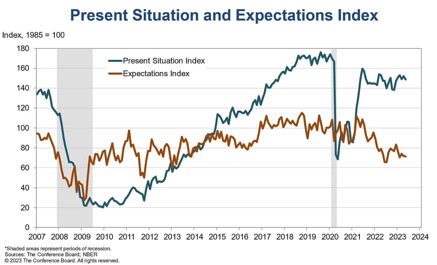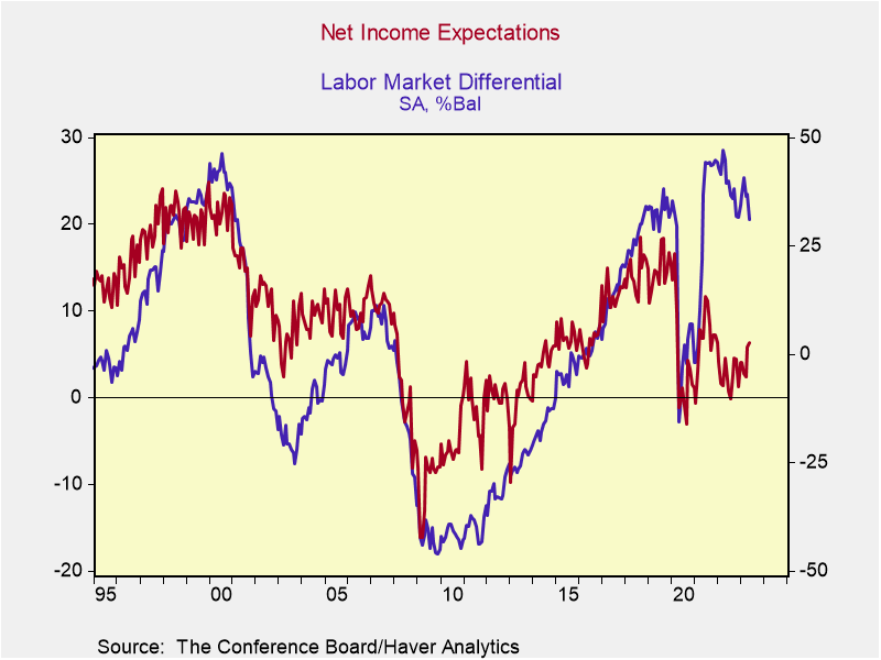 Про отчет Conference Board от Нила Датты из Renaissance Macro: “Основная причина оптимизма в отношении экономики США заключается в том, что инфляция, особенно цены на сырьевые товары, снижаются быстрее, чем рынок труда. В результате реальные доходы будут расти, поддерживая потребление. Мы увидели это в опросе Conference Board, проведенном во вторник. Несмотря на то, что разница на рынке труда снизилась, ожидания по чистой прибыли выросли, поскольку инфляционные ожидания снизились“.