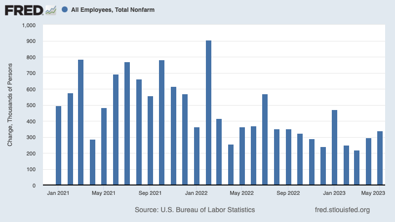 Добавленные в мае 339 000 рабочих мест отражают рост общей занятости на 0,2% по сравнению с предыдущим месяцем. Другими словами, в долгосрочной перспективе прирост или убыль рабочих мест за один месяц - это просто погрешность.