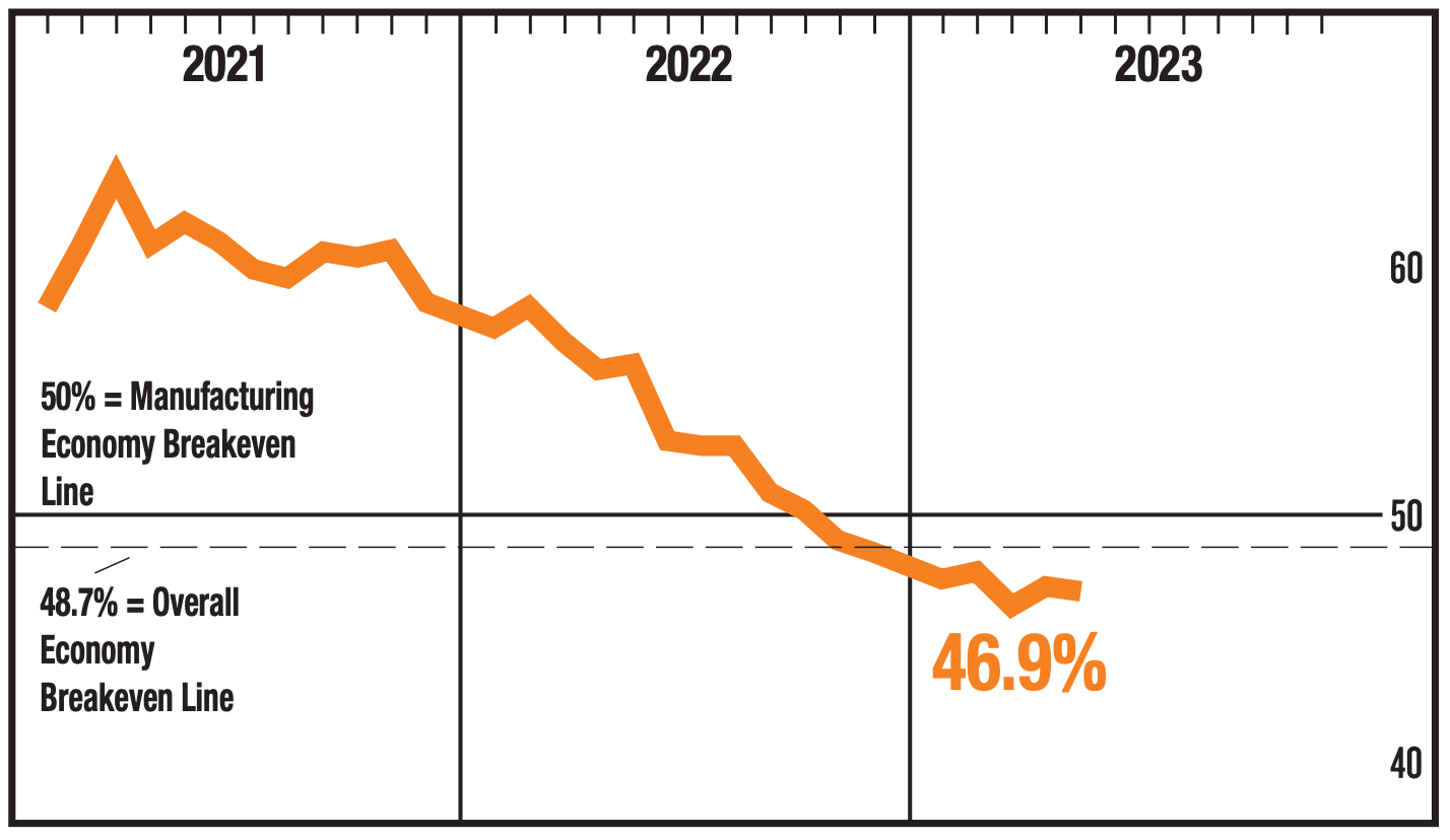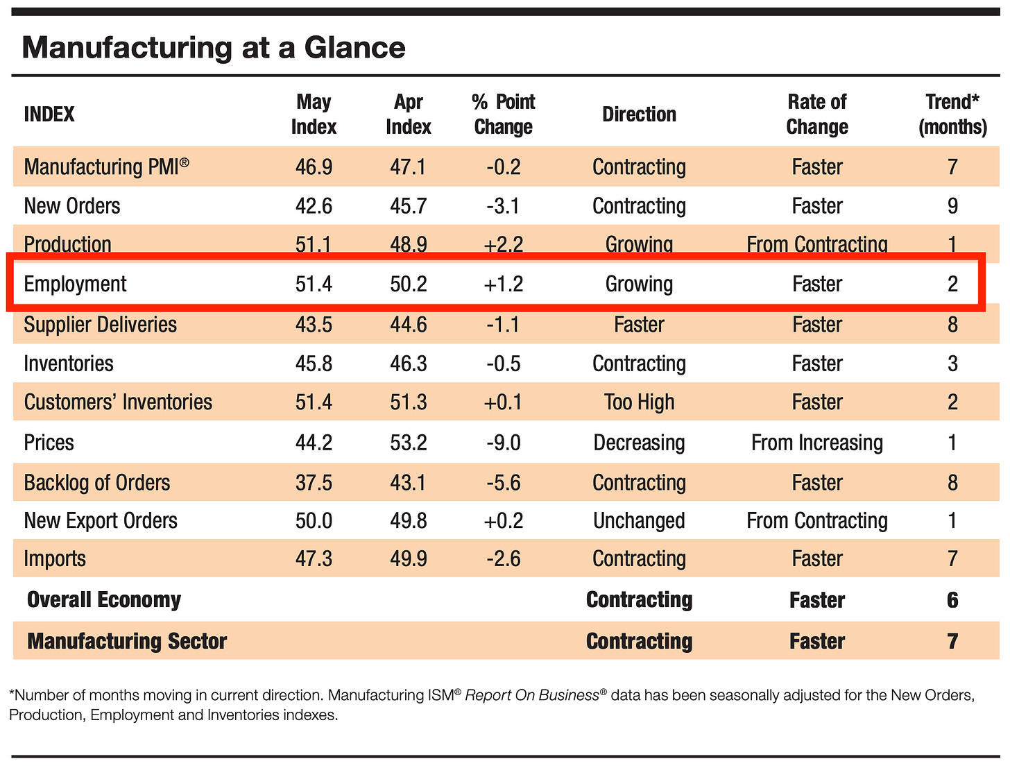 Опрос показывает, что производство охлаждается. Индекс деловой активности в производственном секторе ISM (PMI) снизился до 46,9 в мае с 47,1 в апреле. Значение ниже 50 сигнализирует о сокращении, что говорит о том, что производственная активность сокращалась в течение семи месяцев подряд.