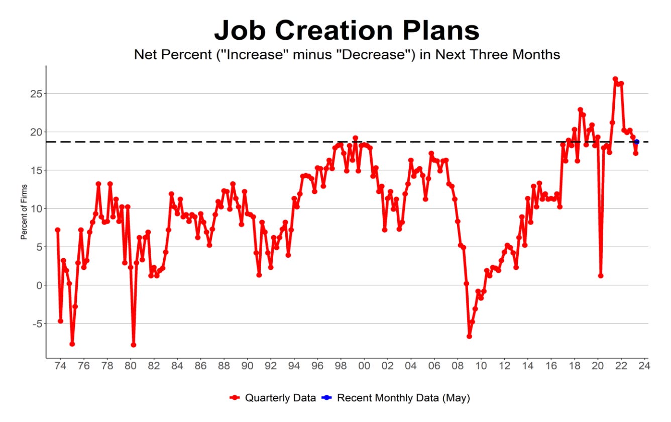 Малые предприятия планируют нанимать сотрудников. Из майского отчета NFIB о рабочих местах в малом бизнесе: “Планы владельцев заполнить открытые вакансии остаются повышенными, с учетом сезонных колебаний 19% планируют создать новые рабочие места в ближайшие три месяца, что на 2 пункта больше, чем в апреле, но на 13 пунктов ниже рекордно высокого показателя в 32, достигнутого в августе 2021 года. Планы по найму явно снижаются, но снижение было постепенным, в результате чего планы по-прежнему остаются исторически сильными перед лицом ослабления экономики, но в более исторически нормальном диапазоне“.