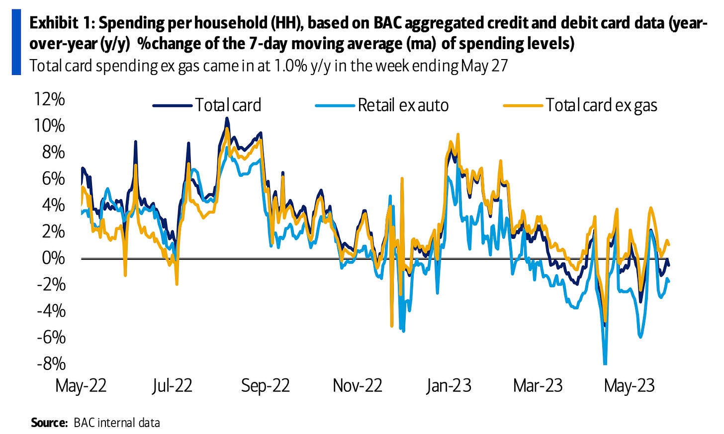 От JPMorgan Chase: “По состоянию на 27 мая 2023 года наши данные о расходах по потребительским картам Chase (нескорректированные) были на 0,8% выше, чем в тот же день прошлого года. Основываясь на данных Chase Consumer Card по состоянию на 27 мая 2023 года, наша оценка возможного контрольного показателя розничных продаж переписи населения США в месячном исчислении составляет 0,28%.“
