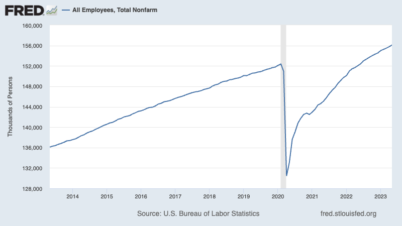 Во-вторых, общая занятость по заработной плате достигла рекордных 156,1 миллиона человек, что на 3,7 миллиона человек больше, чем до пандемического максимума, установленного в феврале 2020 года. Только в 2023 году работодатели создали 1,6 миллиона рабочих мест.