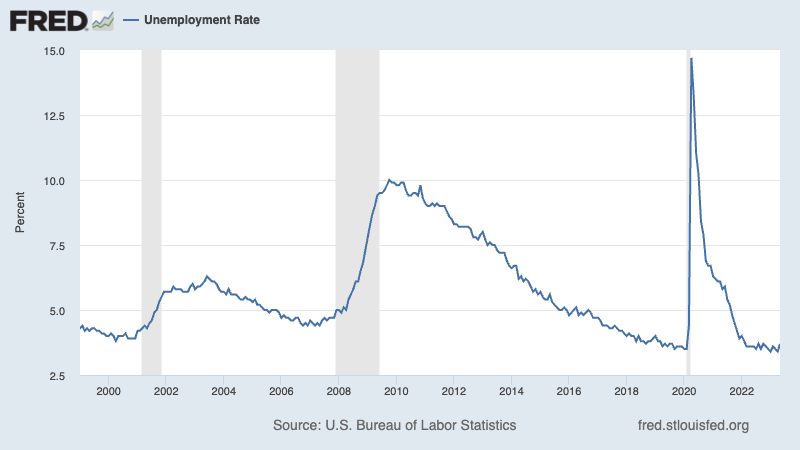 В-третьих, хотя уровень безработицы, возможно, вырос до 3,7% с 3,4% в апреле, он все еще остается низким по историческим меркам и остается на уровнях, которые считаются уровнями экономического роста. Вы едва можете увидеть апрельское движение на графике ниже.