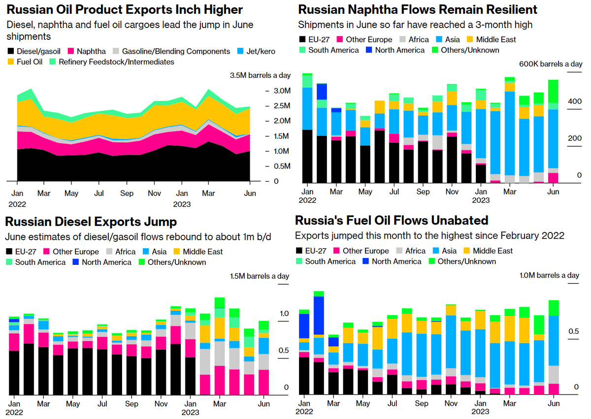 В общем, поставки вот этого вот добра выросли на 51 000 баррелей в день за первые 10 дней месяца. По сравнению со среднедневным уровнем мая. Отметим, что пиковые значения были в марте. В феврале ЕС ввёл запрет на закупки топлива у Москвы. Что-то изменилось для Москвы? Нет. Просто вместо EU-27 в номенклатуре потребителей выросла Other Europe, за которой скрывается Турция. Мощно расширилась Африка, Азия. Появилась Южная Америка. Поставки нафты выросли до 557к барр/день, что на 14% больше майских значений. Её с удовольствием забирает Азия.