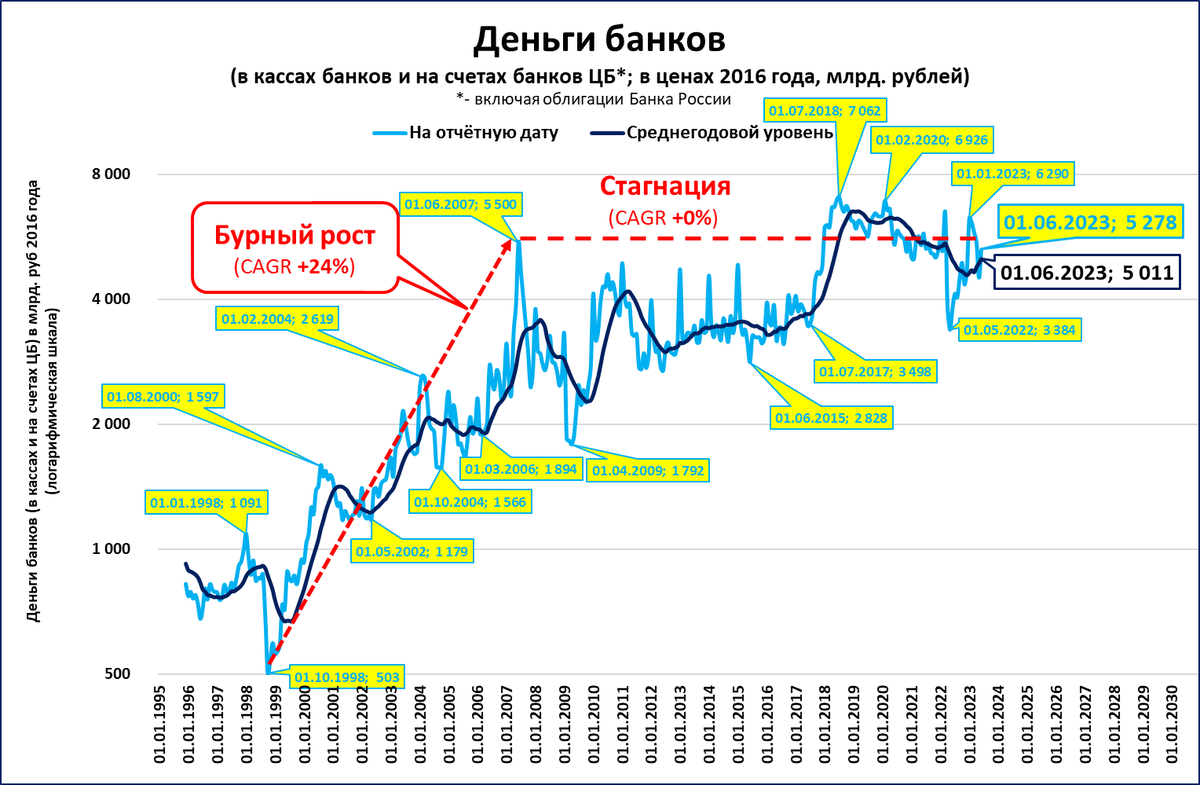 К сожалению, даже после этого роста в реальном выражении деньги банков (= банковские резервы) остаются ниже значений далёкого июня 2007 года.
