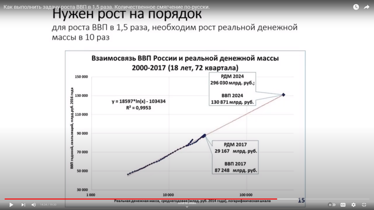 А во-вторых, показал, что для этого реальная денежная масса должна вырасти до 300 трлн. рублей.