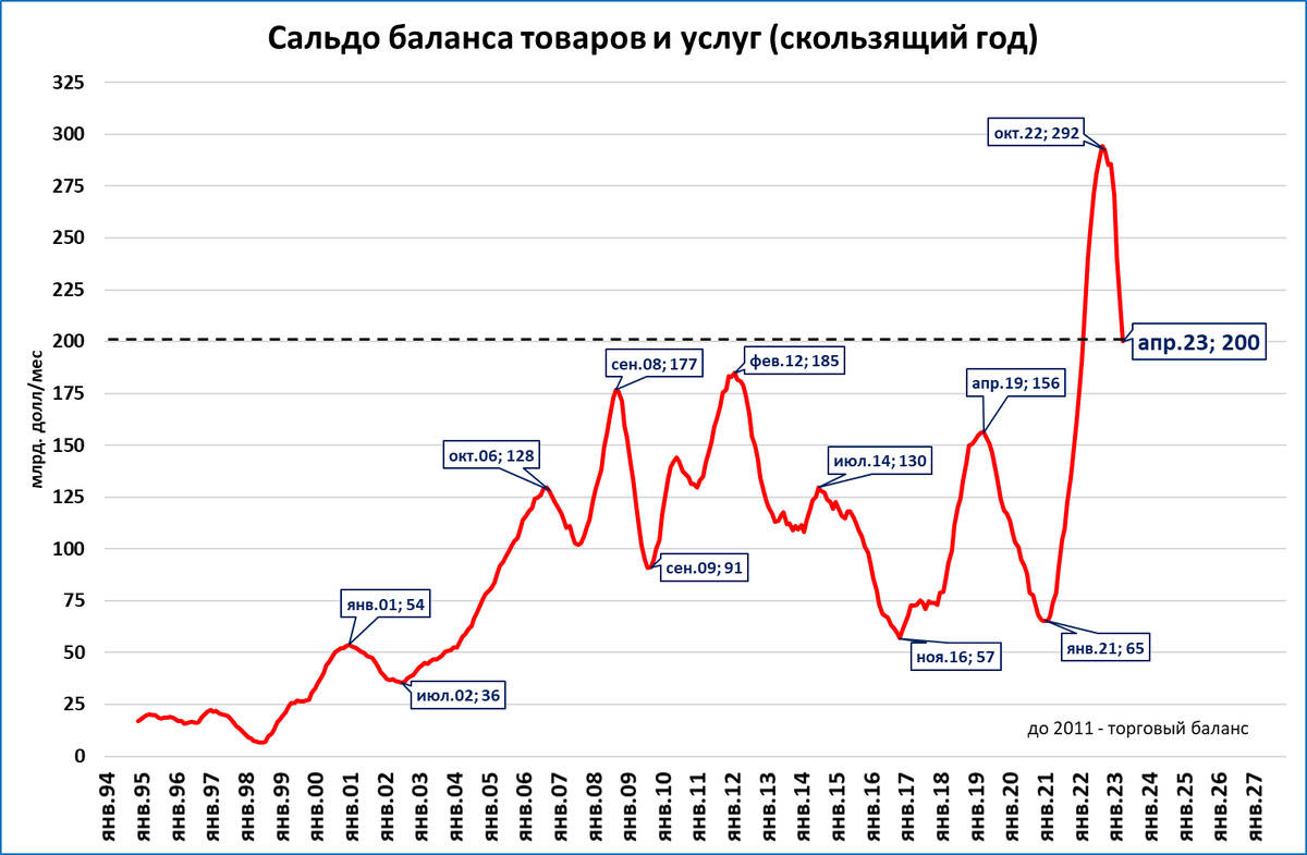 Сальдо за последние 12 месяцев опустилось до 200 млрд. долларов.