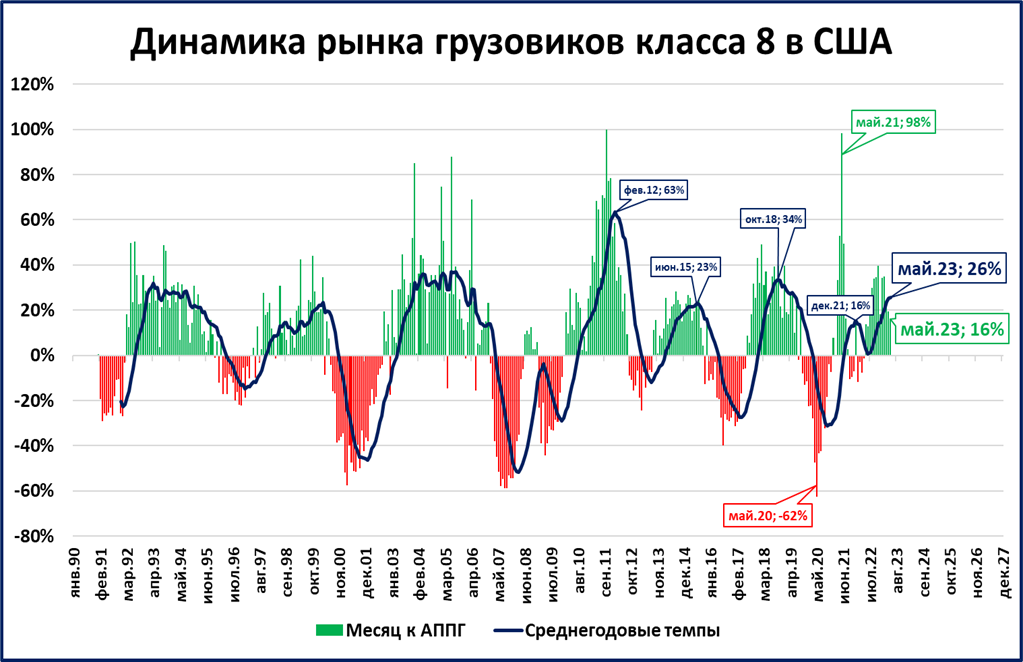 ● В США рынок тяжёлых грузовиков в мае вырос на 16%. Продажи за последние 12 месяцев (276 тыс.) близки к историческому рекорду (284 тыс.), установленному в 2019 году. Текущая динамика (+16%) ниже среднегодовой (+26%), что говорит о замедлении роста.