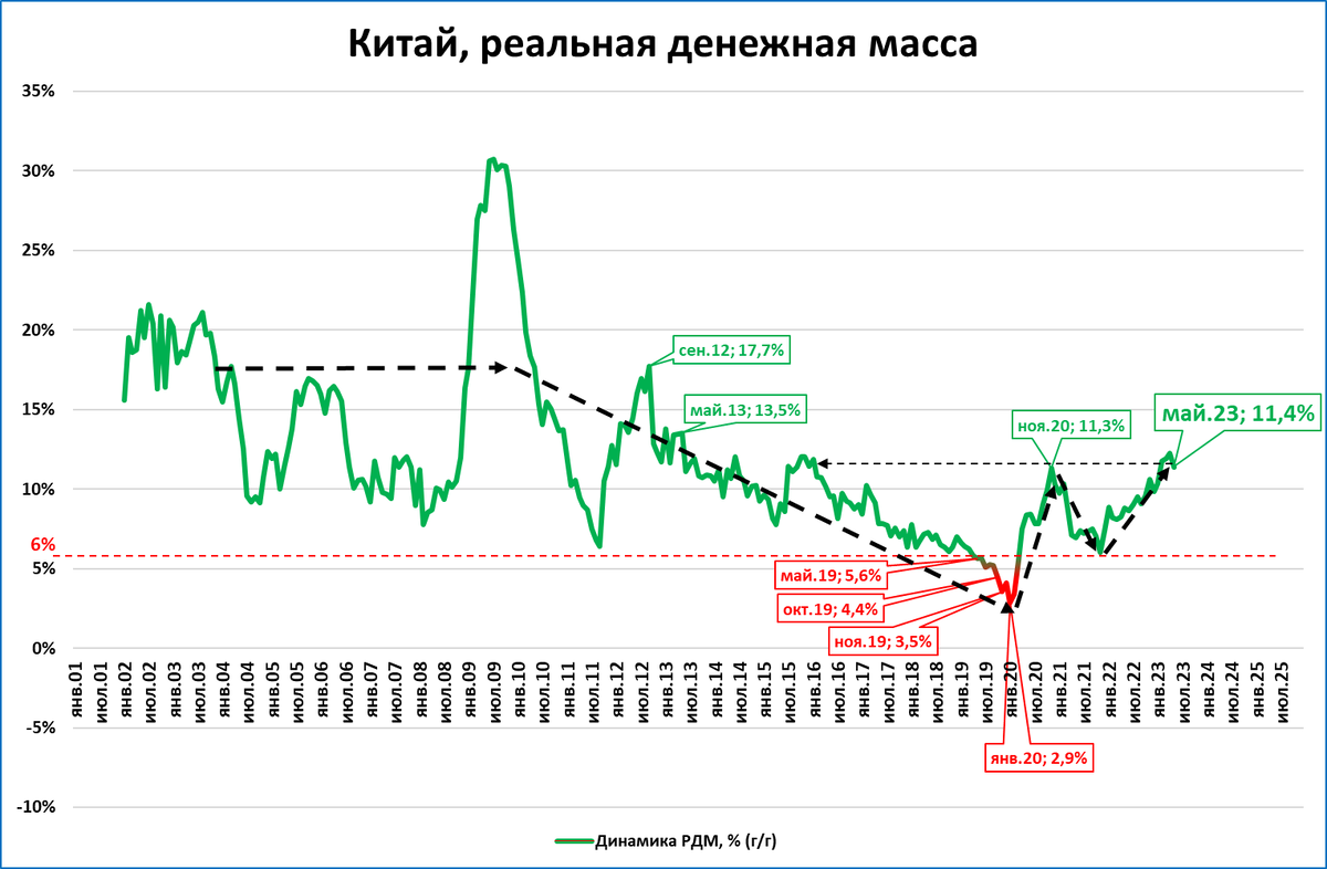 ● В Китае реальная денежная масса растёт быстрее, чем в конце 2020 – начале 2021 года. Денежно-кредитные предпосылки для роста экономики на 8% сохраняются.