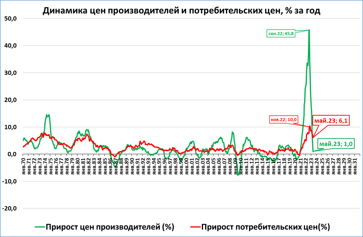В прошлом году и начале этого года всё выглядело хорошо. Несмотря на высокую инфляцию (10% в ноябре 2022), цены производителей росли ещё быстрее — это позитивный факт.