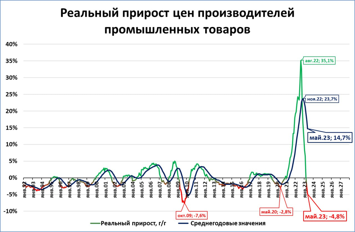 Снижение реальных цен производителей -- признак кризиса. Обратите внимание: во время всех прошлых кризисов (1998, 2008, 2015, 2020, 2022) реальные цены производителей снижались.
