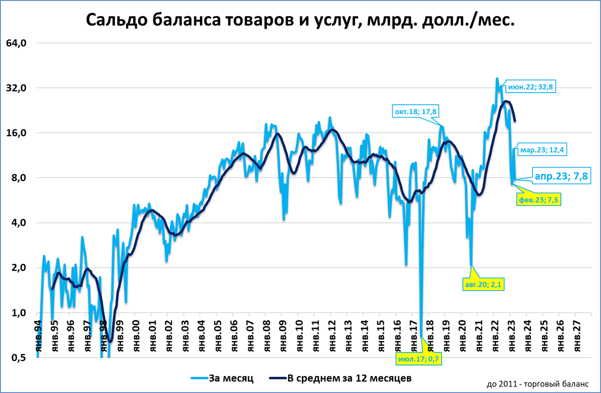 Сальдо торговли товарами и услугами в апреле оставалось положительным: +7,8 млрд. долларов.