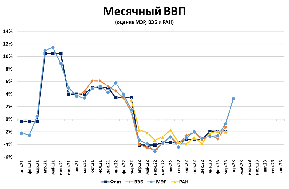 Так, ВВП в апреле, по такой оценке МЭР, вырос на 3,3% к апрелю прошлого года.