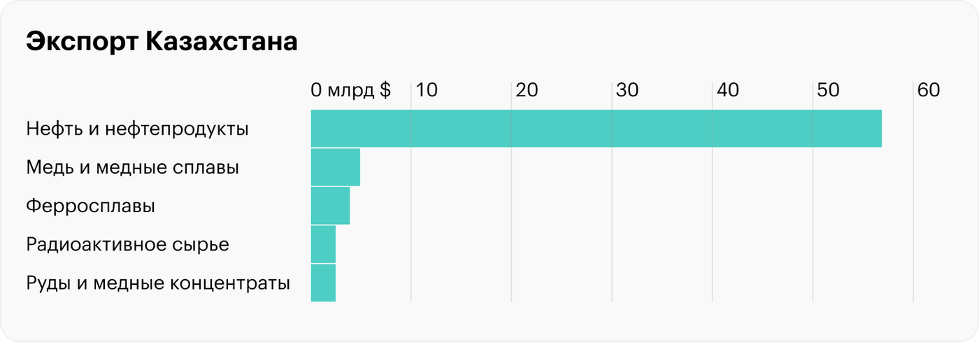 У Казахстана иная структура экономики: она в меньшей степени сервисная, а в большей экспортная — в стране делают ставку на промышленность. Производство товаров дает почти 40% ВВП, включая 14,5% от горнодобывающей промышленности и 13,2% от обрабатывающей.