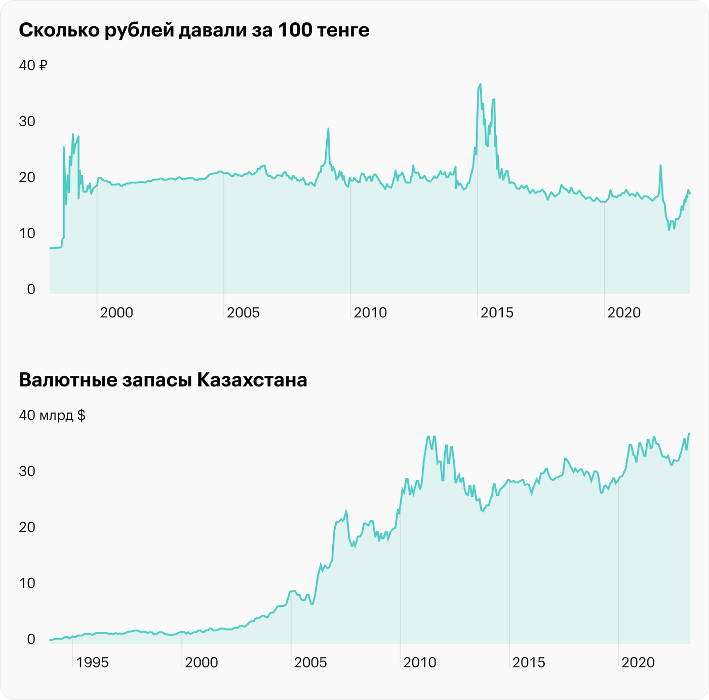 К апрелю 2023 у Казахстана было 35,6 млрд долларов резервов в иностранной валюте и золоте. Это немало, но и не так много: в случае сильного обвала тенге резервов для поддержания курса национальной валюты может не хватить.