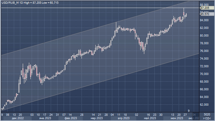 Российский рубль ослаб в среду, 28 июня, потеряв поддержку со стороны налоговых платежей в конце месяца, а также из-за того, что инвесторы внимательно следят за последствиями неудавшегося вооруженного мятежа ЧВК «Вагнер» в минувшие выходные.