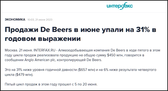Но вероятно в этом году продажи будут ниже, т.к. у основного конкурента компании De Beers продажи падают. В частности, в июне они снизились на 31% год к году. А в мае снижение составило 20%. Из-за этого De Beers уже дважды в этом году снижала цены на алмазы.