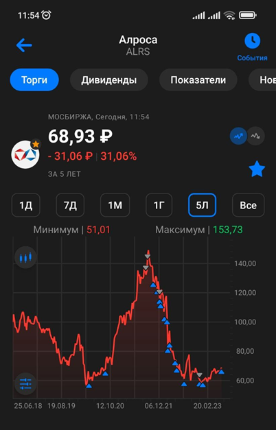 После фиксации прибыли более 100% в середине 2021 года, я заново начал формировать позицию. На данный момент доля АЛРОСА в моём портфеле около 5%. Позиция пока в минусе на 25%.