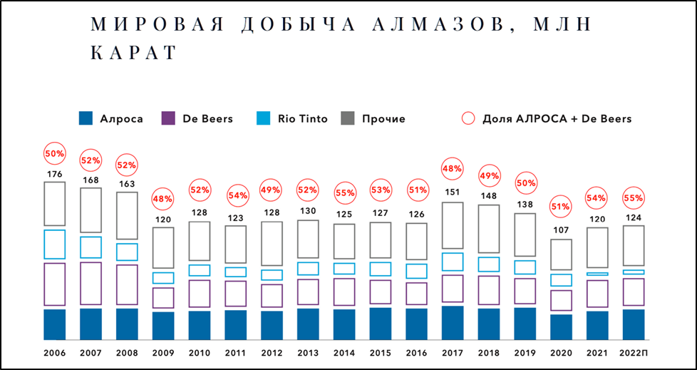 Добыча алмазов в 2022 г. 35,6 млн карат (+10% г/г).